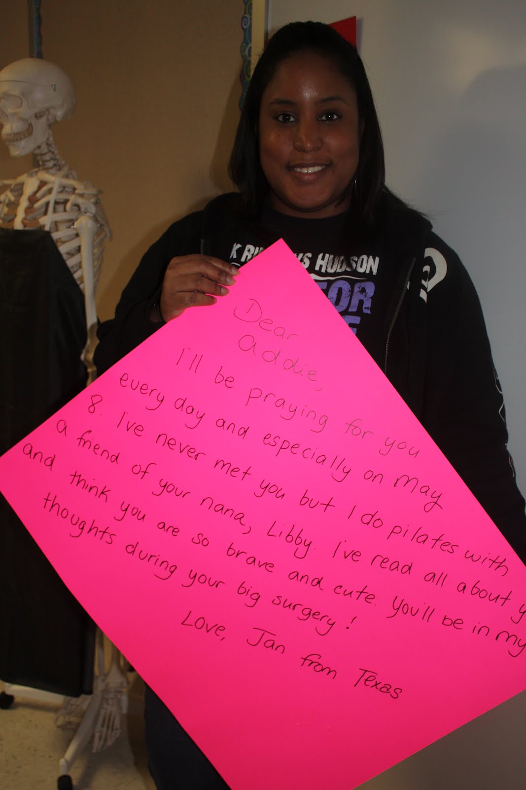 I have decided that over the next 6 weeks while we prepare for this huge day, I want to do something for Addie, for now but even more, for her in the future. I know there are hundreds of people praying for her and I want to ask ALL of you who are praying or sending Addie love and well wishes for a HUGE favor- I want to make a photo wall and photo book of prayers for Addie for May 8. My dream is to cover Addie's hospital room walls with photos of people and their prayers so that every person who walks in Addie's hospital room will be blown away by the love and prayer being sent for this little girl. My prayer is that her room would be covered in prayer, literally. That when my mom sits in Addie's room after surgery while I'm off in my separate room recovering for a couple of days that she will feel surrounded my the faces of those praying for Addie. And that as Addie grows up, she can look back and see just how loved she is and how covered in prayer she was on that monumental day in her life. So here is my plea- I want a photo of each person praying for Addie holding a whiteboard, poster or piece of paper with a prayer, a hope, a wish, a memory, a Bible verse, or simply an ‘I love you’ or ‘I’m thinking of you’ for Addie on it. I am wanting you to send just the photo of the message, not the actual poster! My friends have so generously agreed to model for you (with names and messages made by me of course!)...